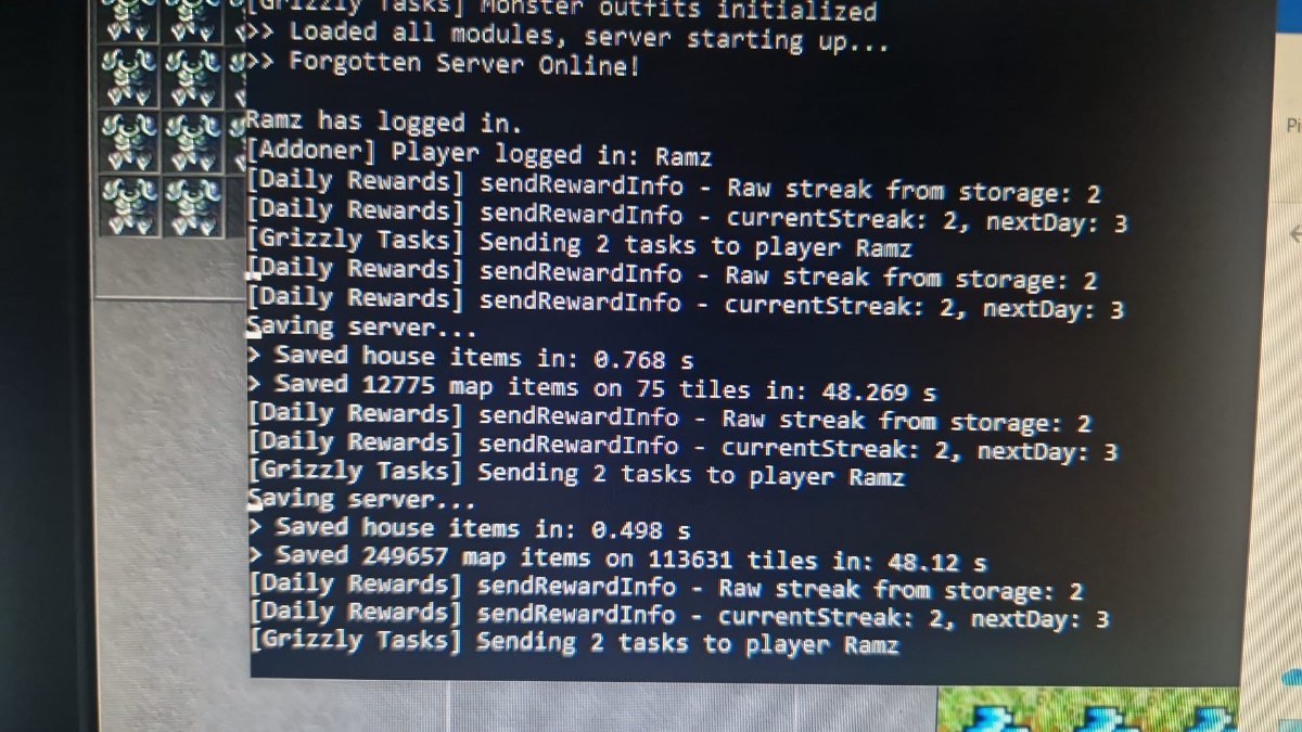 usariodenome 1148 Postado 11 de Junho Compartilhar Postado 11 de Junho Testei o sistema e guardei até 650 mil artigos com sucesso em poucos nanossegundos. A iteração do mapa inteiro para um ficheiro de 72 megabytes demorou cerca de 48 segundos em média. Pode ver na consola uma comparação entre salvar alguns tiles e algumas centenas. Eu uso o sistema de zonas e o zoneId 1 codificado para os tiles que não guardo em binário. Também não salva: zona de proteção tiles de propriedade bloqueados (por exemplo, mesas grandes, pedras etc.) tiles de casa (o houseitemsave faz isso na base de dados). DISCORD: wirless_pl This is the hidden content, please Entre ou Cadastre-se 9 Link para o comentário https://tibiadevs.com/forums/topic/1145-tfs-1x-sistema-para-guardar-itens-no-mapa/ Compartilhar em outros sites Mais opções de compartilhamento...