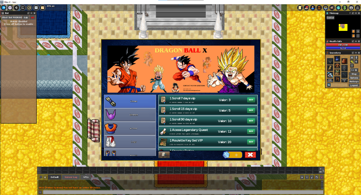 Esse DBO foi o primeiro na TFS 1.x. Eu vendi com exclusividade, no entanto eu comecei a receber contato de outras pessoas para tirar duvida relacionado a BASE. Por esse motivo, decidi contribuir com a comunidade! Para quem deseja iniciar um projeto na TFS 1.5 de Dragon Ball, essa base é uma das melhores disponíveis. Sistemas: Reborn Nave Speed attack com o fist Sistema de MagDamage no vocation.xml Source muito bem otimizada, + de 15 personagens ja feitos com magias e etc... itens feitos. Effects e Missiles extendido, Anti RollBack Dungeon (Não esta feito a parte do server, somente cliente.) Algumas Imagens: Downloads: Scan:18 pontos