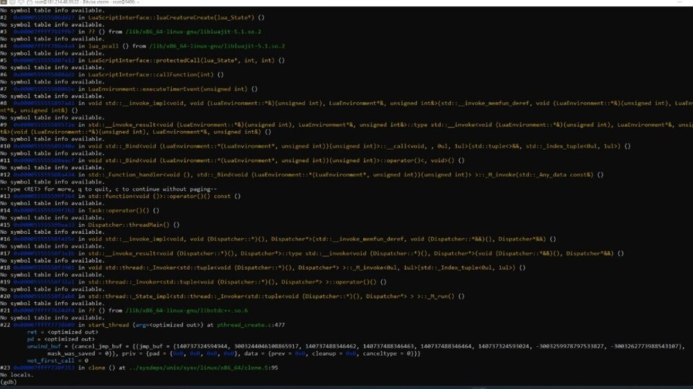 #10 0x000055555589240a in void std::Bind<void (LuaEnvironment::(LuaEnvironment, unsigned int))(unsigned int)>::_call<void, , 0ul, 1ul>(std::tuple<>&&, std::_Index_tuple<0ul, 1ul>) ()
