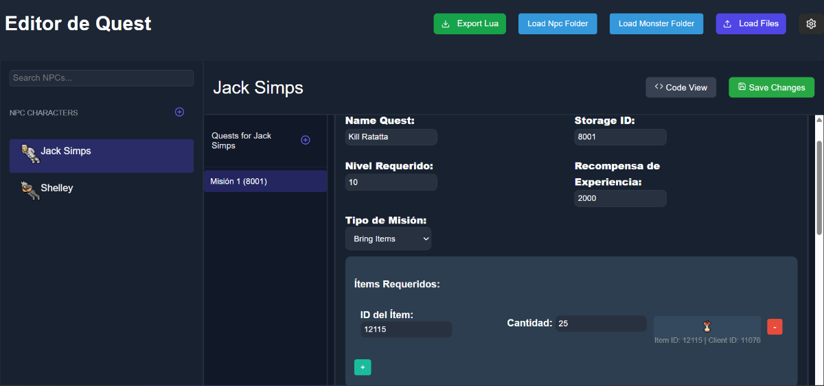 It lets you create, customize, and export quests using a simple and visual interface, ready to plug into your OTServer.