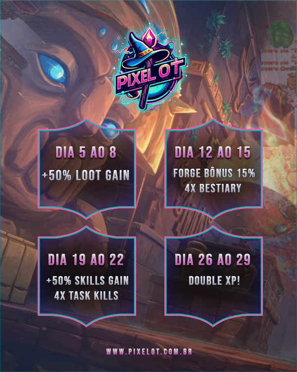| LANÇAMENTO BRAZZINUM | NOVO CLIENT | MAJOR UPDATE MARÇO | | EVENTO 1 ANO DE PIXELOT | www.pixelot.com.br Tudo está preparado para receber vocês em nosso novo mundo! Estamos na reta final para o primeiro major update de março, com contagem regressiva e muita ansiedade para o grande lançamento. ✅ Criação de contas e personagens já disponível! ✅ Sistema Multi-World: Seus coins podem ser usados em ambos os mundos! ✅ Major Update + Cliente 14: Sexta-feira, 07/03. ✅ Lançamento do servidor Brazzinum: Quinta-feira, 13/03, às 20h. ✨ O que vem por aí? 🔹 Novas hunts para cobrir lacunas de level cap (Level 10k+). 🔹 Conteúdos inéditos e novas missões. 🔹 Nova classe inicial (Level 1000): Monk. 🔹 Sistema de profissões inovador. 🔹 Reformulação de preços da store e balanceamento da economia e dos loots. 🔹 Otimização do servidor, garantindo uma jogabilidade fluida e estável. 🔥 É o Brazzinum o mundo novo da galera ! 🔥