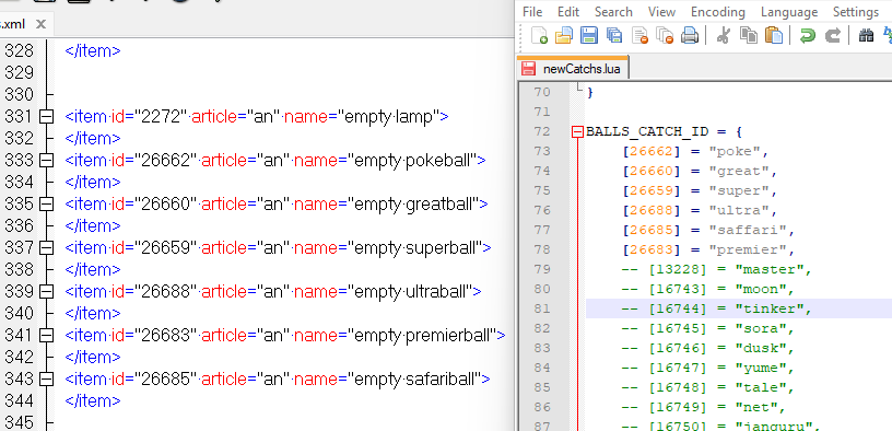 A estrutura do pokemonster é meio diferente, não encontrei "newFunctions", porém achei o arquivo "NewCatchs" dentro da "lib" e se for esse o local certo esta configurado com os ids das "empty ball". Ou sera que devo colocar o "id" das ball sem descrição, pois aqui tem "used ball", "fainted ball", "empty ball" e "ball" sem nenhum adjetivo junto. =================== EDIT Testei com os id dos que ta só "pokeball","ultraball" etc ai nem jogava a ball, voltei pro id das "empty ball" ta capiturando porém a ball vem fainted.
